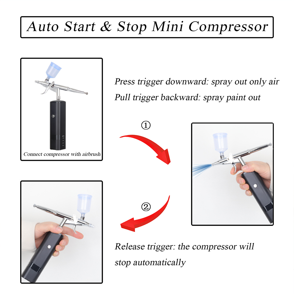 This compact mini airbrush compressor comes with a double-action airbrush.The double-action airbrush kit controls the air volume and the amount of paint at the same time which allows changing the width of the line,the range of value,and the opacity of paint without stopping,that makes your works more professional.