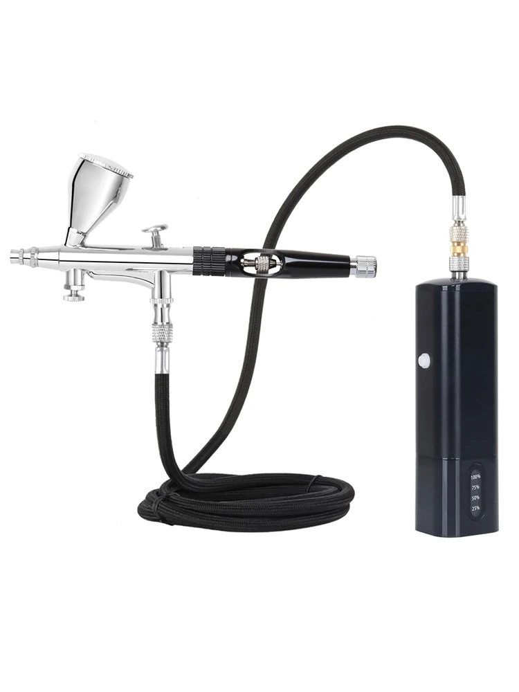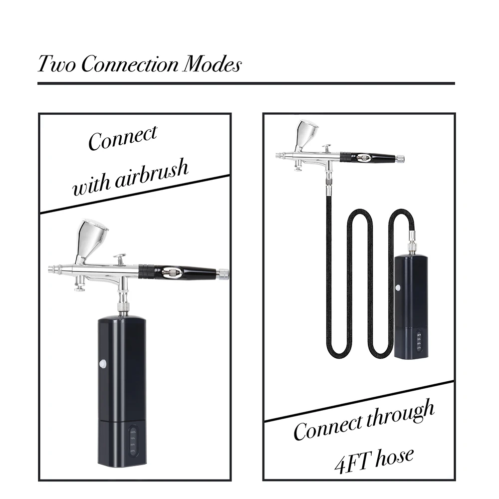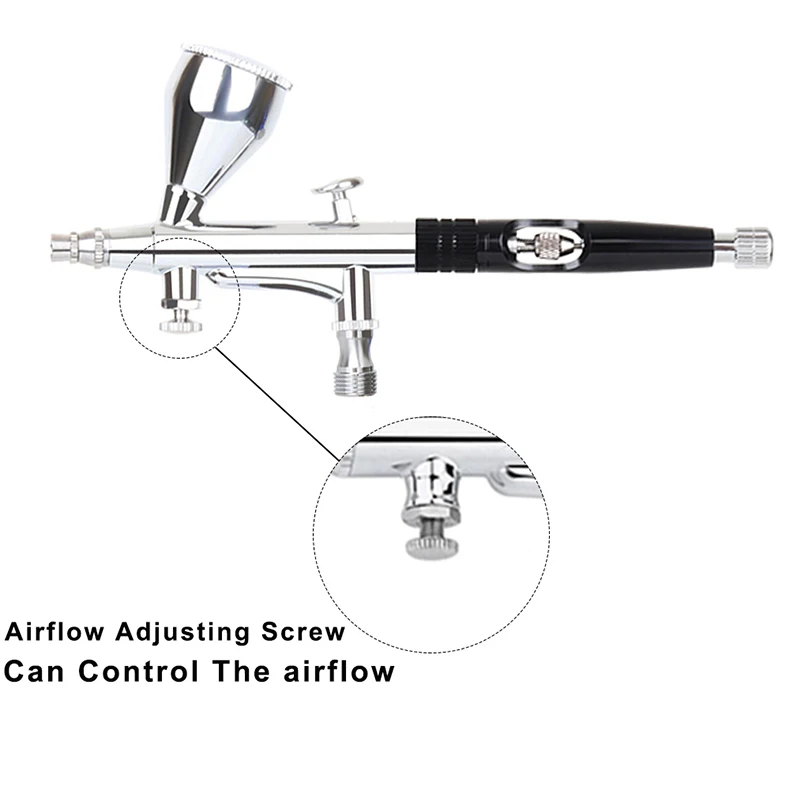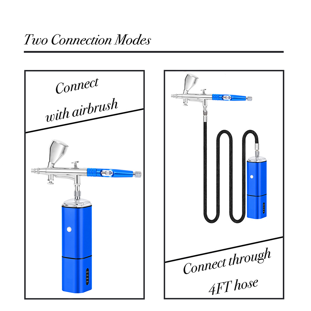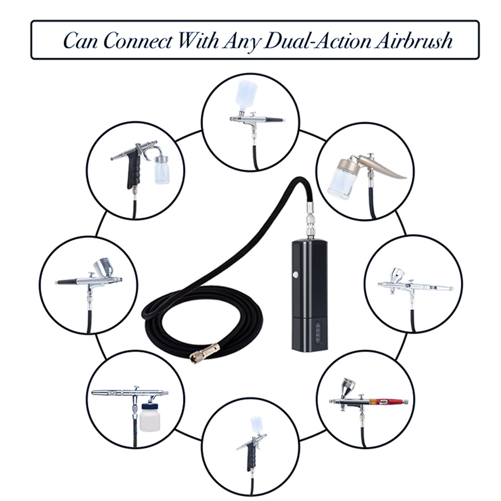 Compared with dual action airbrush,this compact mini airbrush compressor comes with a double-action airbrush.The double-action airbrush kit controls the air volume and the amount of paint at the same time which allows changing the width of the line,the range of value,and the opacity of paint without stopping,that makes your works more professional.