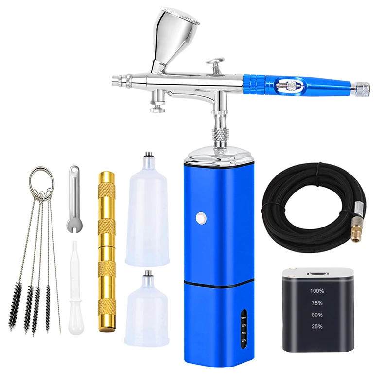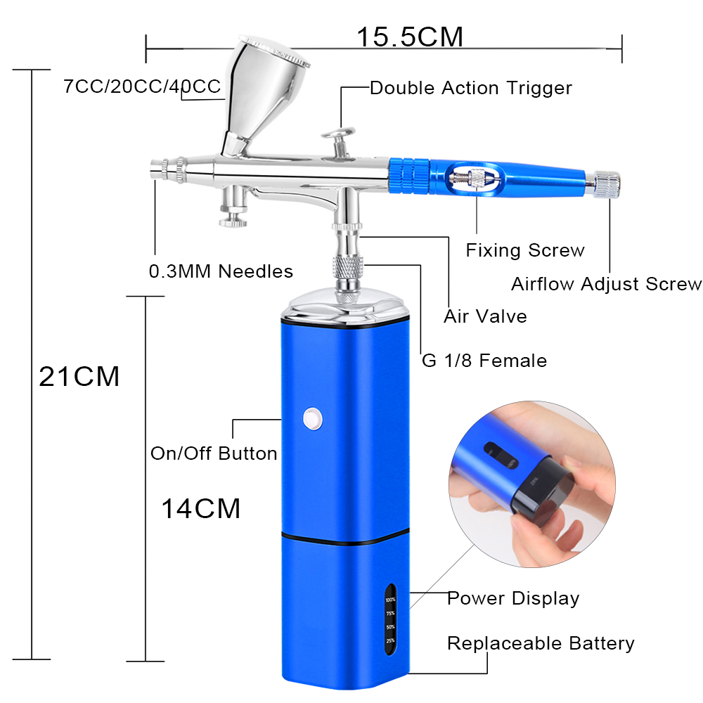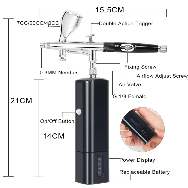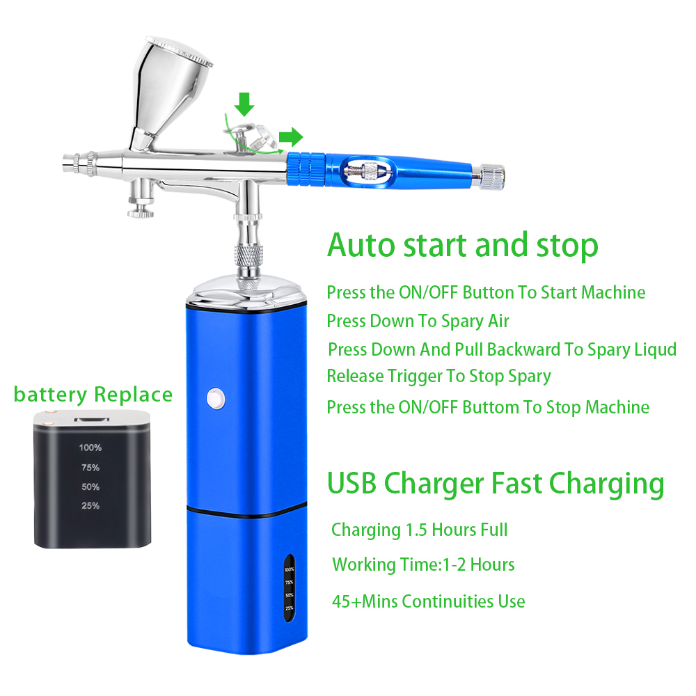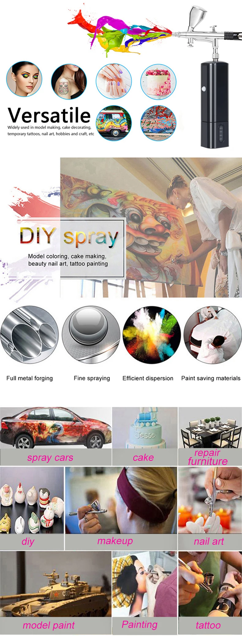 Portable cordless airbrush kit can be used for cake decorating, makeup, nails design, tattoo, model painting, art painting, handicraft and so on.