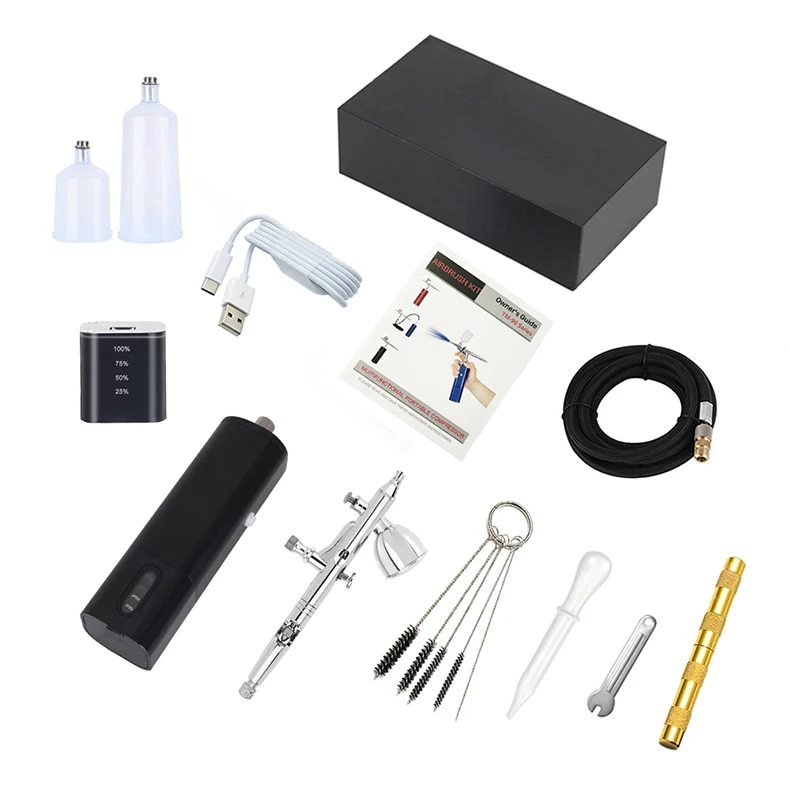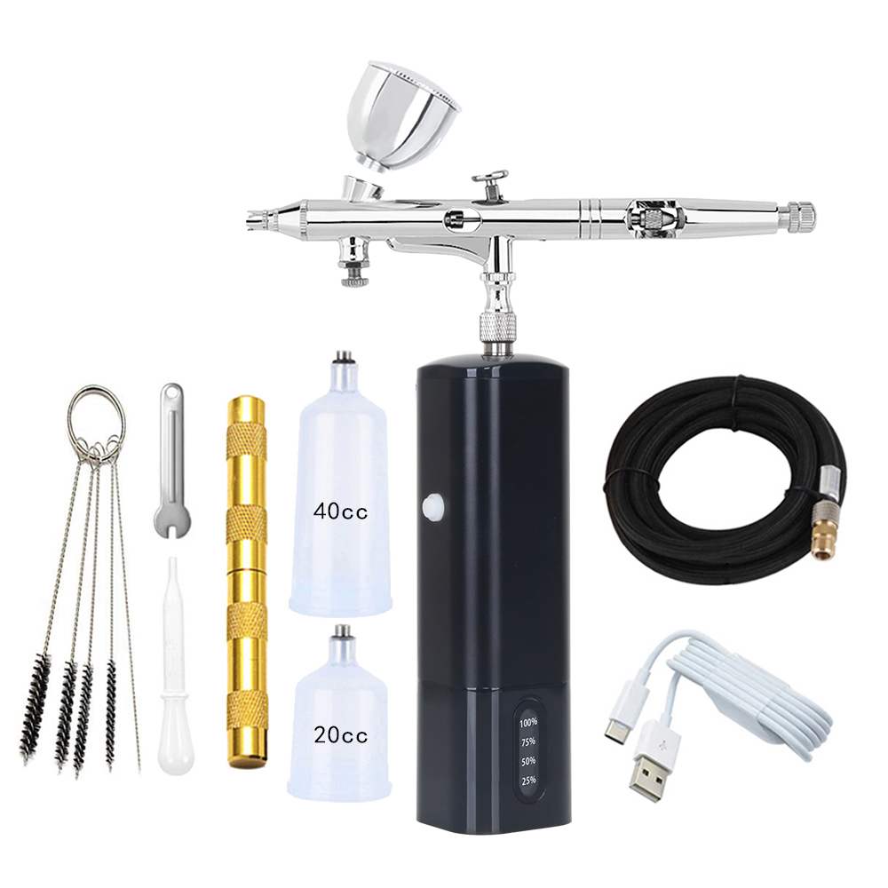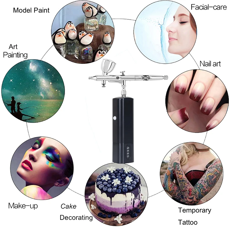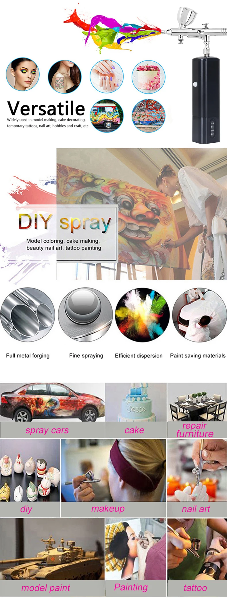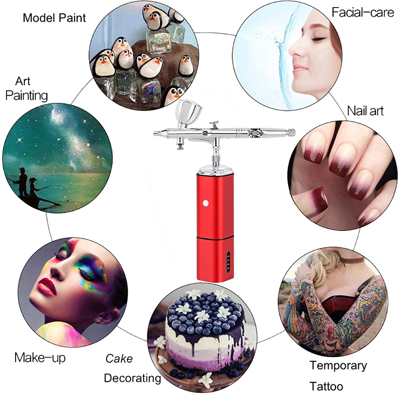 Portable cordless airbrush kit can be used for cake decorating, makeup, nails design, tattoo, model painting, art painting, handicraft and so on.
