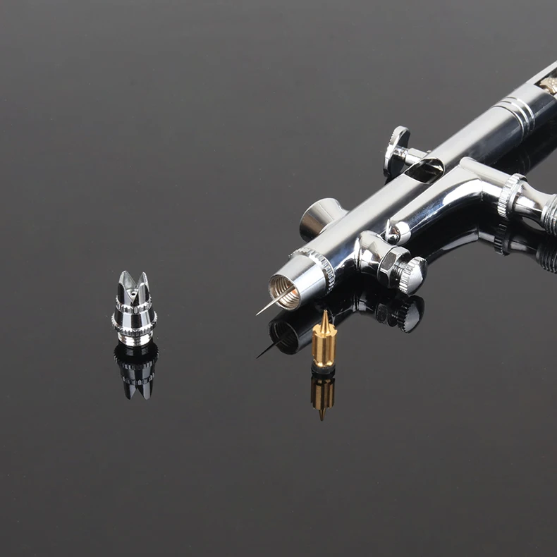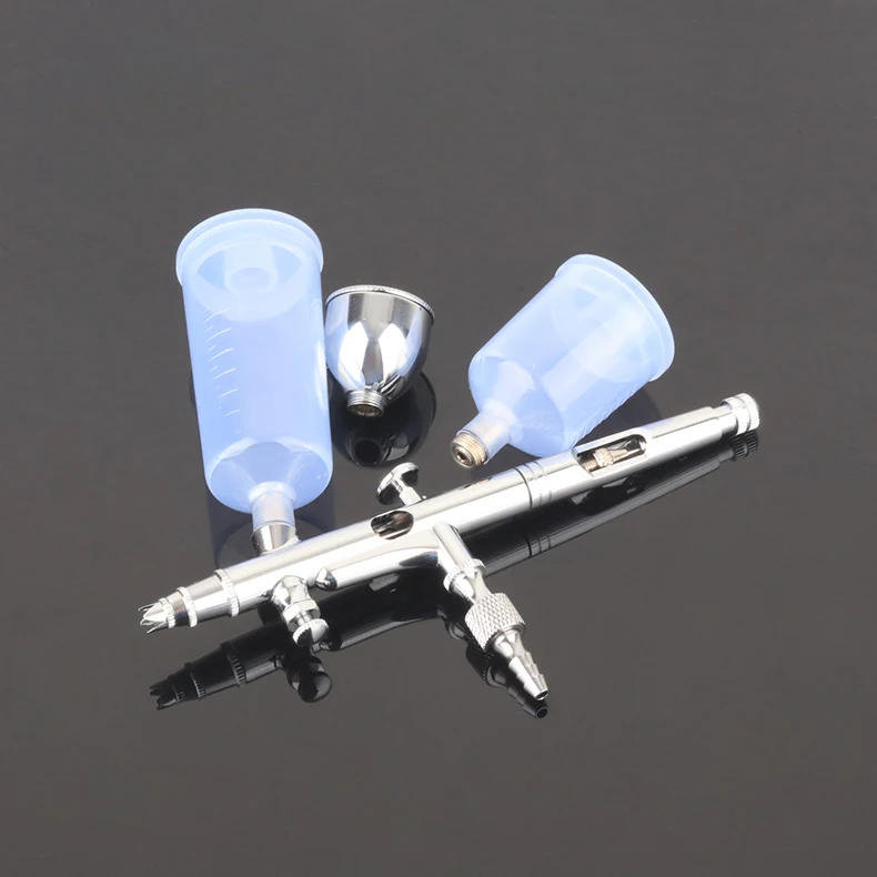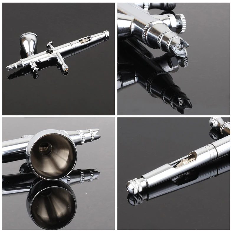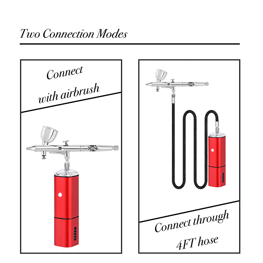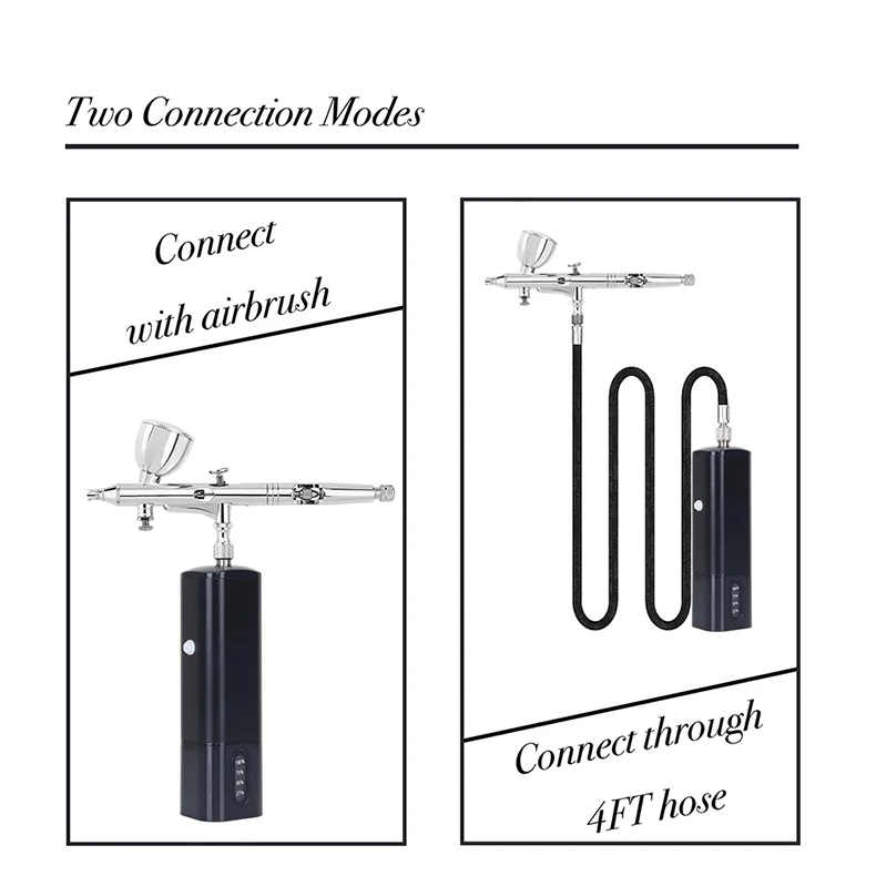 Compared with dual action airbrush,this compact mini airbrush compressor comes with a double-action airbrush.The double-action airbrush kit controls the air volume and the amount of paint at the same time which allows changing the width of the line,the range of value,and the opacity of paint without stopping,that makes your works more professional.