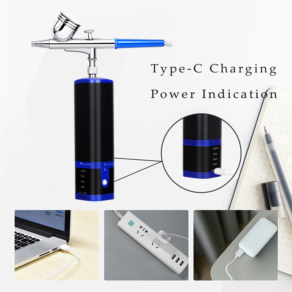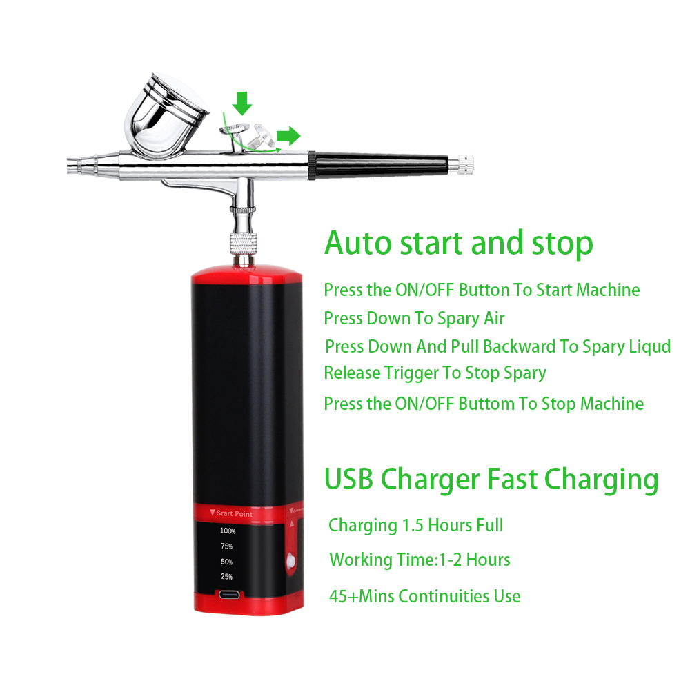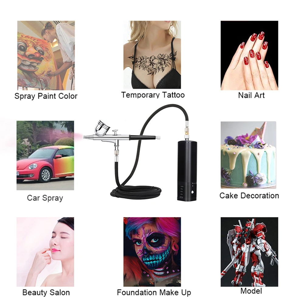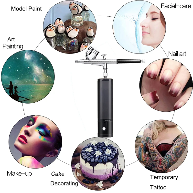 airbrush painting kit can be placed in your backpack or pocket,it's light weight and easy to carry around.Portable cordless airbrush kit can be used for cake decorating,makeup,nails design,tattoo,model painting,art painting,handicraft and so on. The airbrush must be cleaned thoroughly after each use to avoid nozzle clogging or uneven spraying.