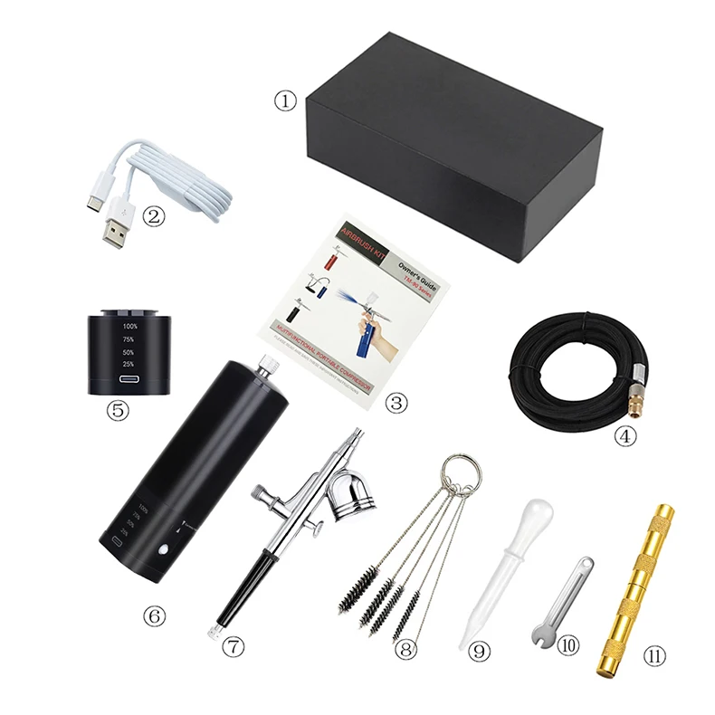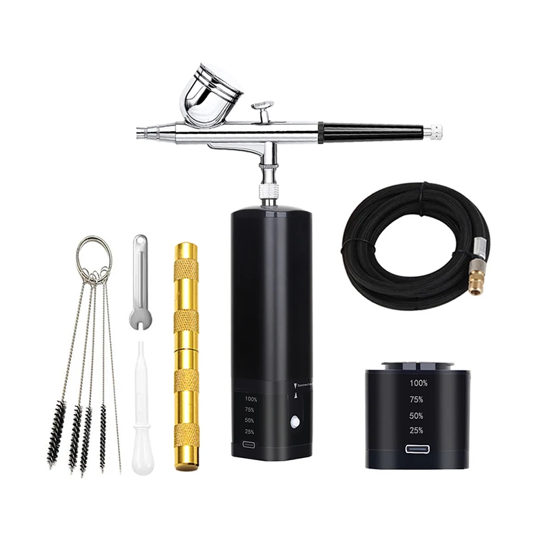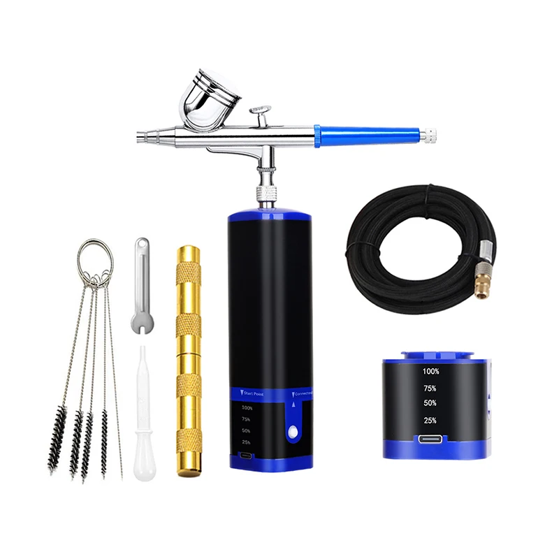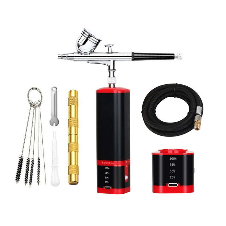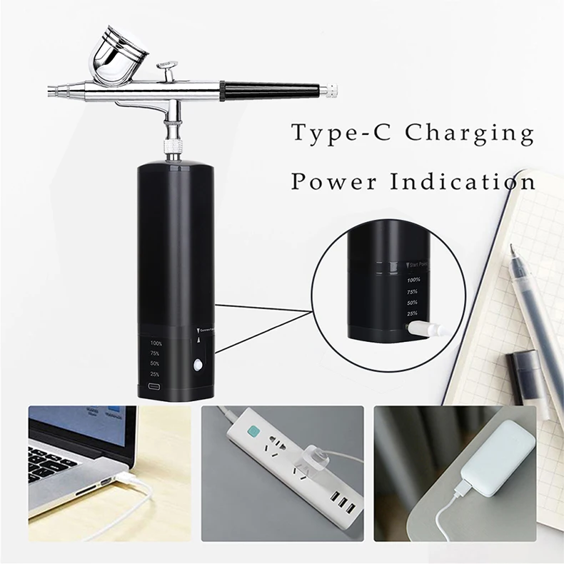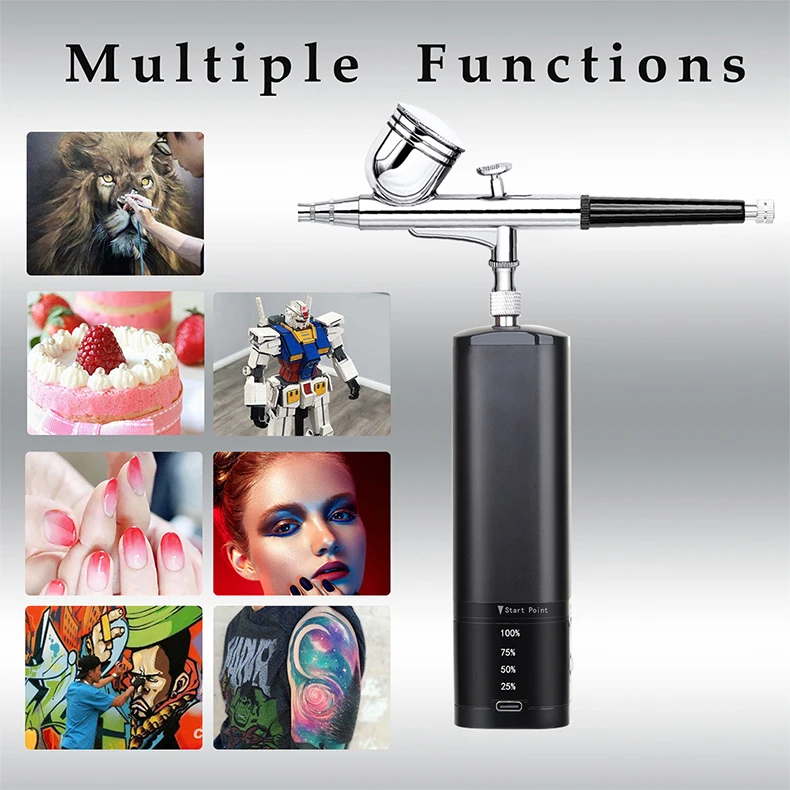 airbrush painting kit can be placed in your backpack or pocket,it's light weight and easy to carry around.Portable cordless airbrush kit can be used for cake decorating,makeup,nails design,tattoo,model painting,art painting,handicraft and so on. The airbrush must be cleaned thoroughly after each use to avoid nozzle clogging or uneven spraying.