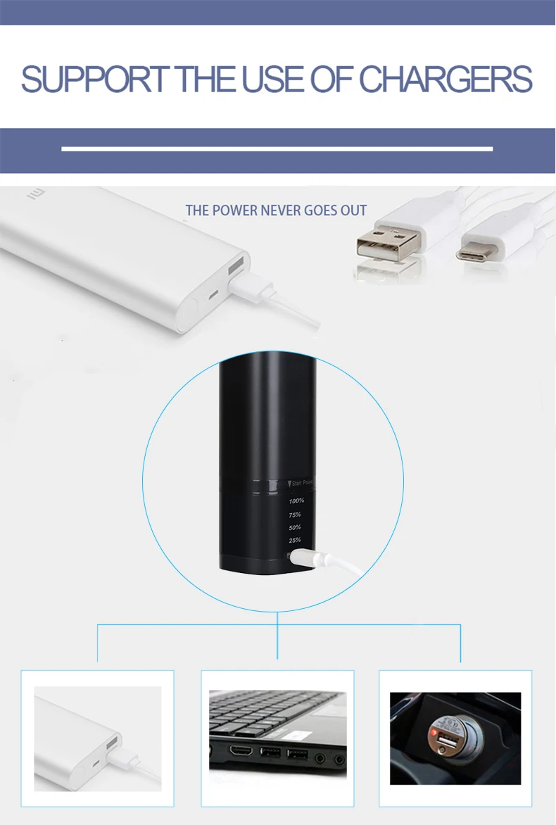 Just like a mobile phone, after a single charge, it can be used anywhere, even without a power supply. Fully charged, can be used for 50 minutes. With USB charging cable, you can use computer charging, charger charging, or power bank charging.