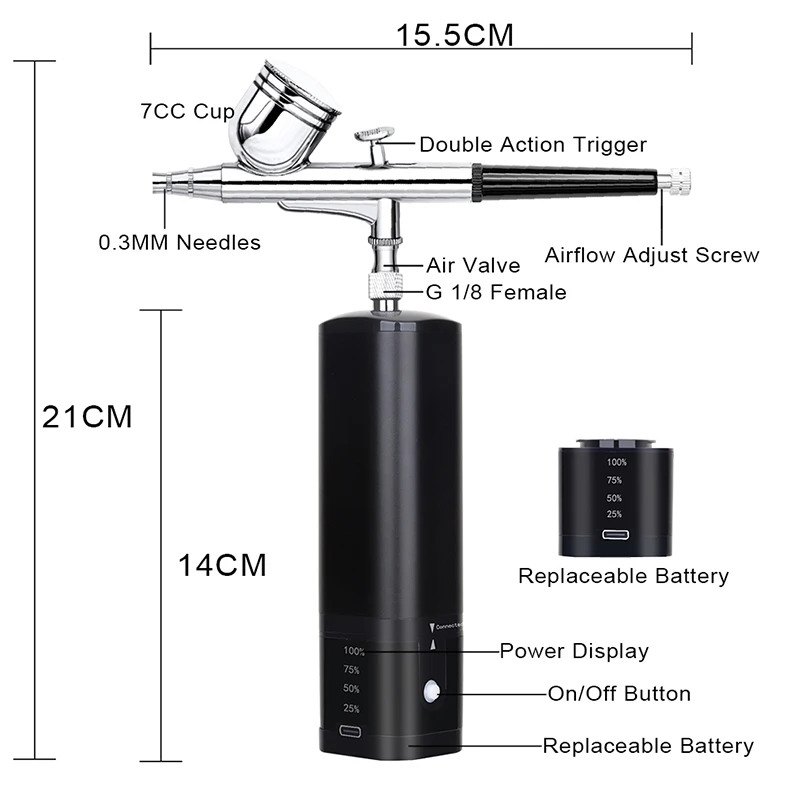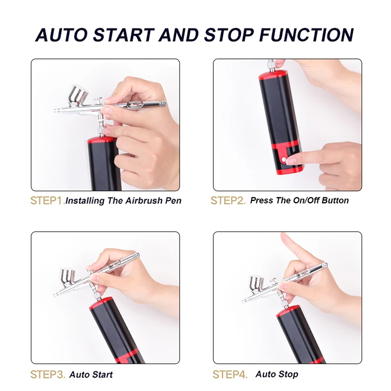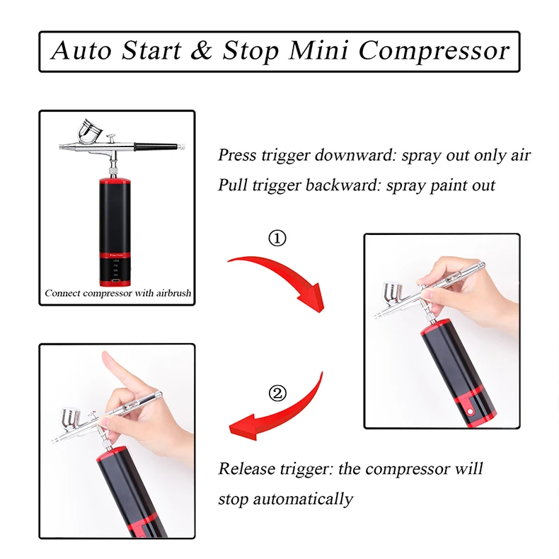 This compact mini air compressor comes with a double-action airbrush, removable 7ML metal reservoir and replaceable 20ML 40ML plastic liquid cup. The handheld airbrush kit controls the amount of air and paint at the same time, that makes your works more professional. You can press the power button and then the trigger to spray the water-based liquid pigment or paint out with strong air.