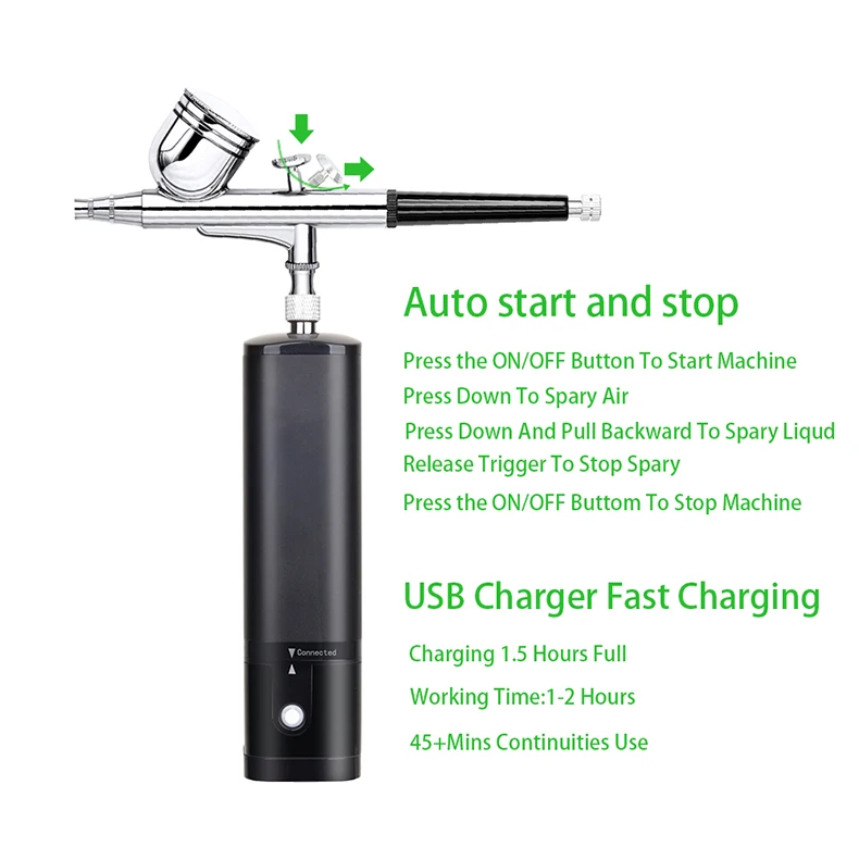This beauty special air compressorcan use for makeup, beauty, nail, temporary tattoos, cake decorating, low dense degree of dye, etc.and shall not be used for spraying thick paint.