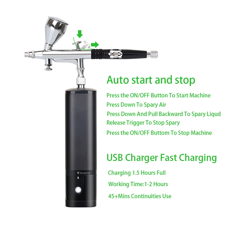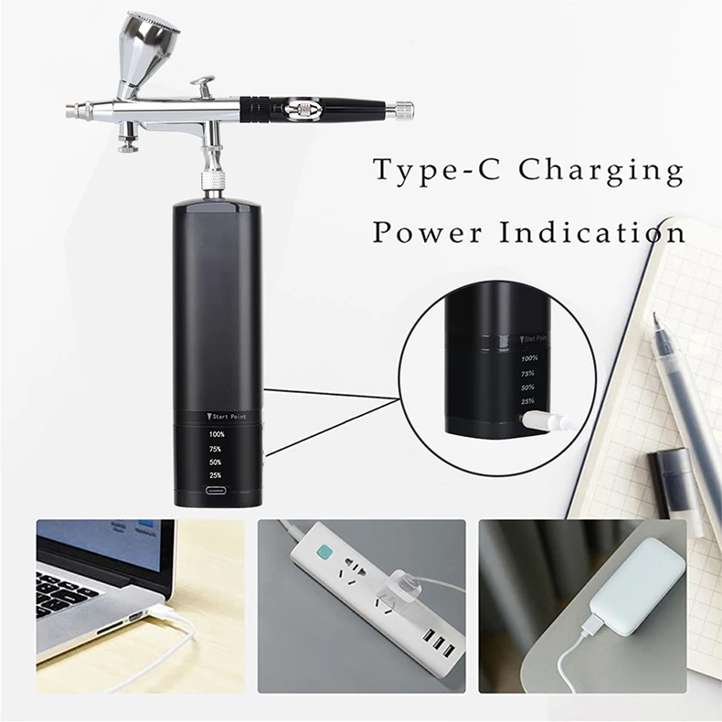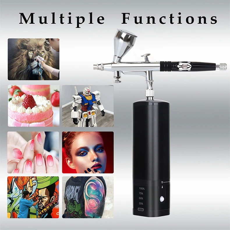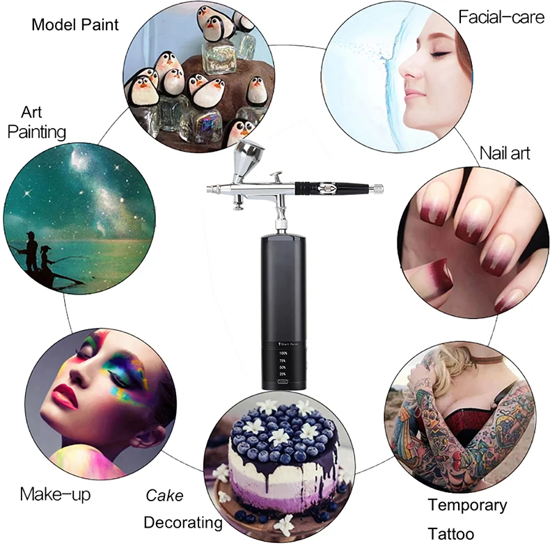 airbrush painting kit can be placed in your backpack or pocket,it's light weight and easy to carry around.Portable cordless airbrush kit can be used for cake decorating,makeup,nails design,tattoo,model painting,art painting,handicraft and so on. The airbrush must be cleaned thoroughly after each use to avoid nozzle clogging or uneven spraying.