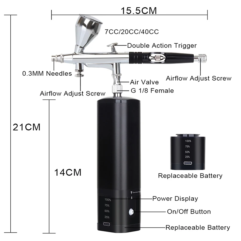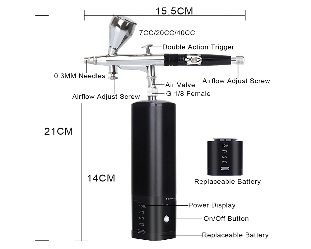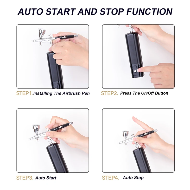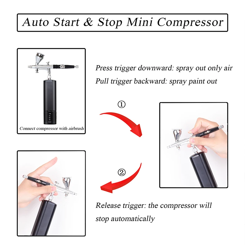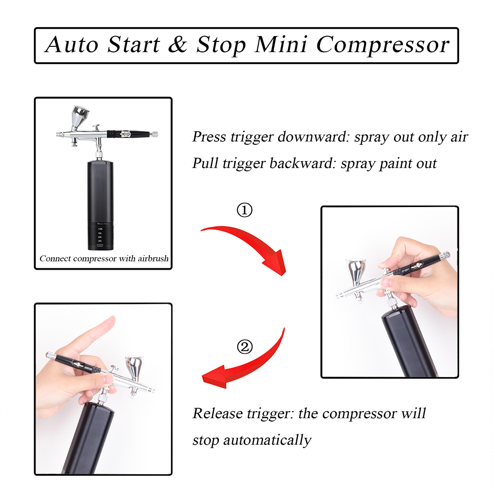 This compact mini air compressor comes with a double-action airbrush, removable 7ML metal reservoir and replaceable 20ML 40ML plastic liquid cup. The handheld airbrush kit controls the amount of air and paint at the same time, that makes your works more professional. You can press the power button and then the trigger to spray the water-based liquid pigment or paint out with strong air.