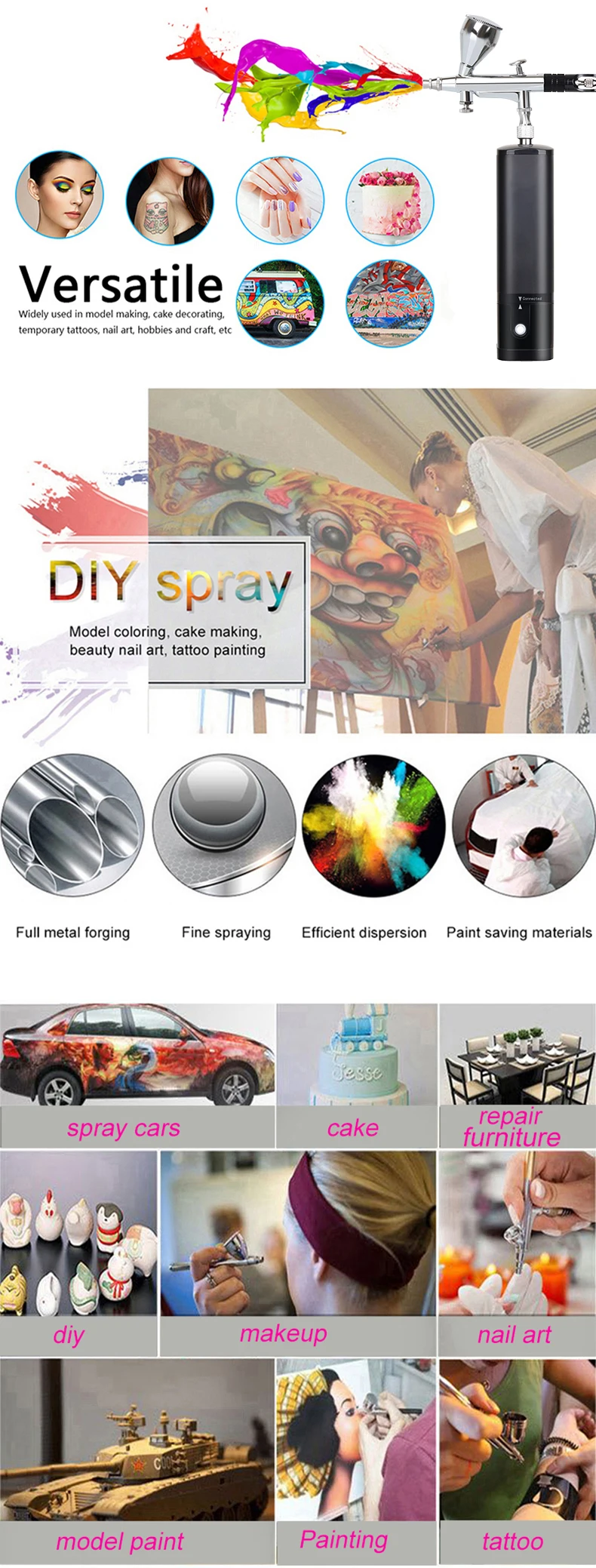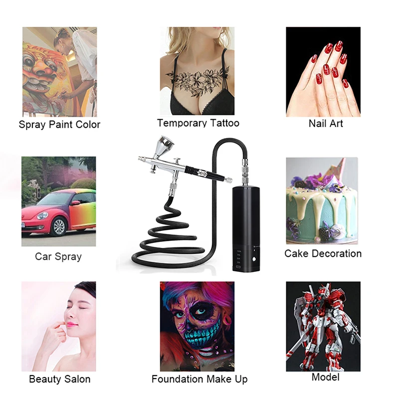 This beauty special air compressorcan use for makeup, beauty, nail, temporary tattoos, cake decorating, low dense degree of dye, etc.and shall not be used for spraying thick paint.