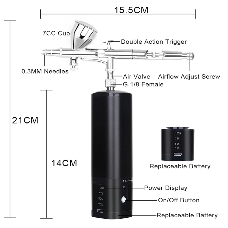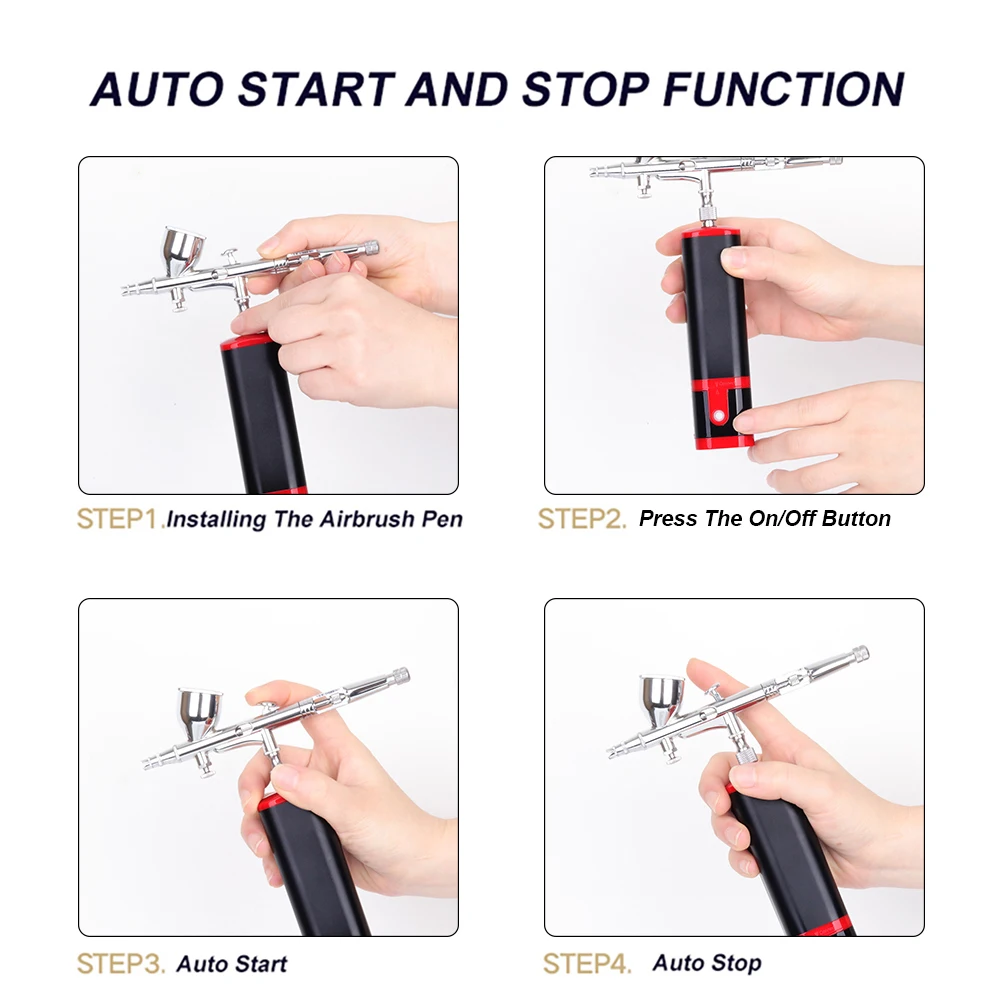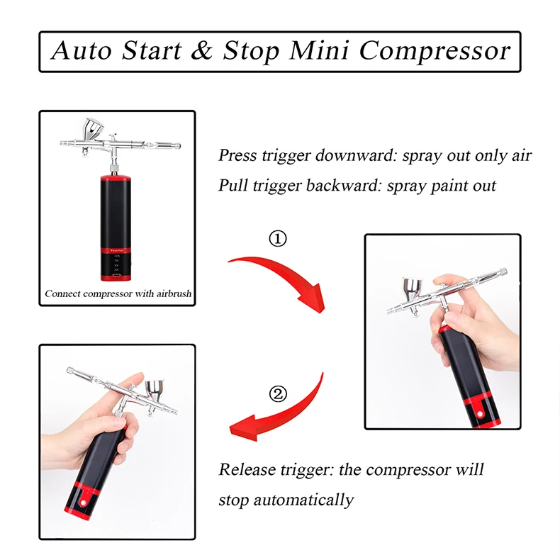 This compact mini air compressor comes with a double-action airbrush, removable 7ML metal reservoir and replaceable 20ML 40ML plastic liquid cup. The handheld airbrush kit controls the amount of air and paint at the same time, that makes your works more professional. You can press the power button and then the trigger to spray the water-based liquid pigment or paint out with strong air.