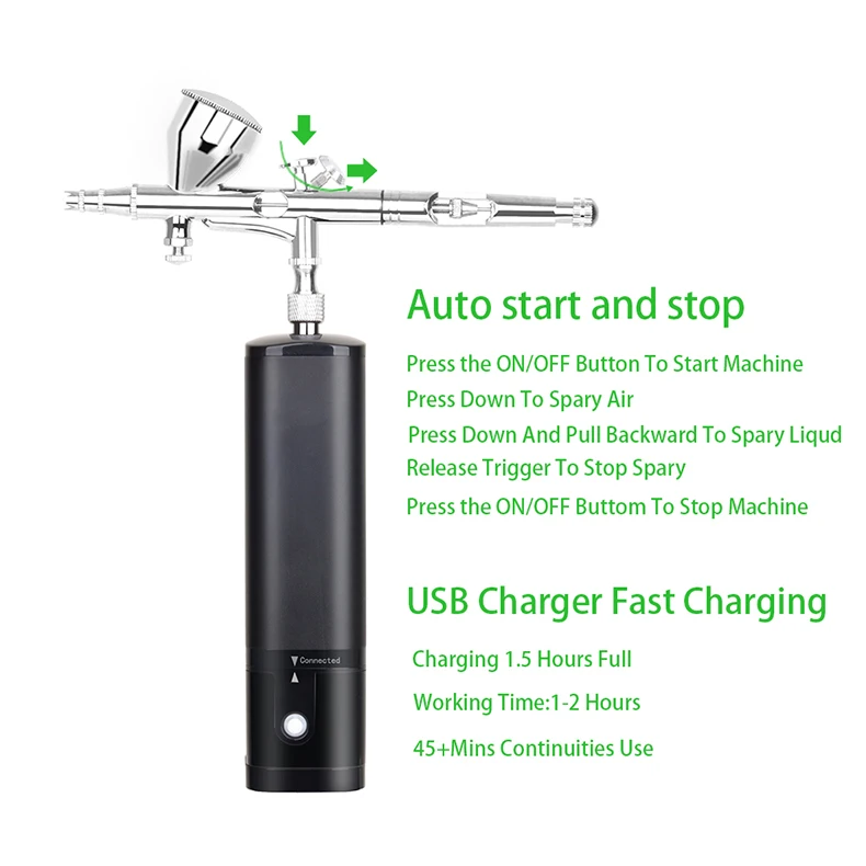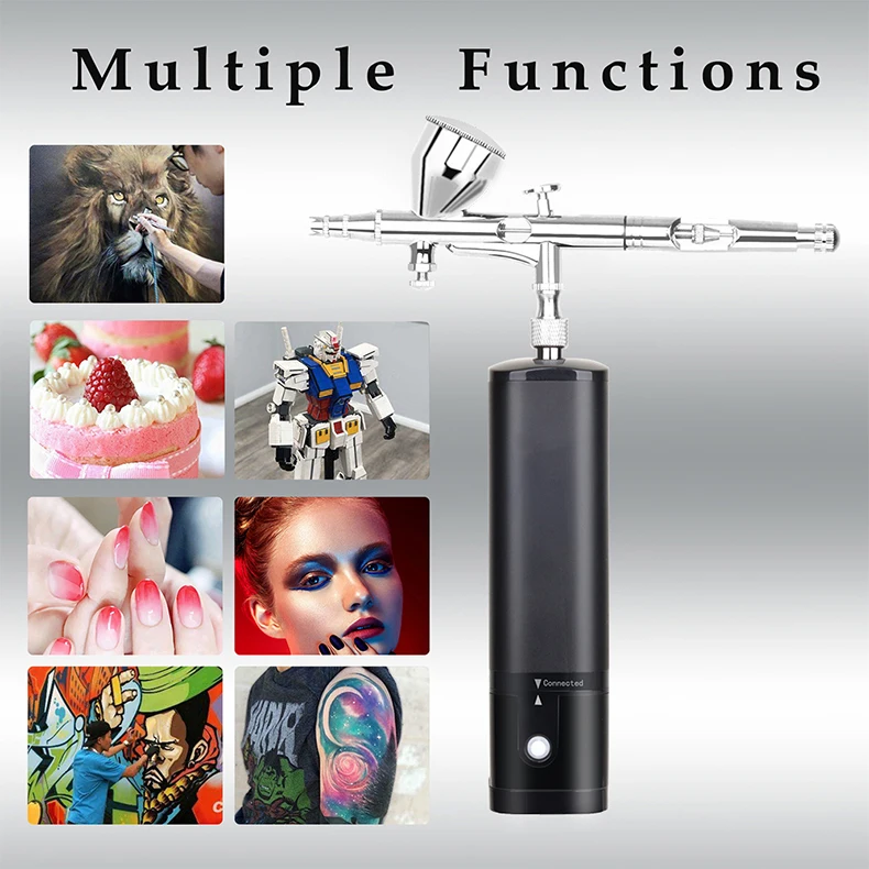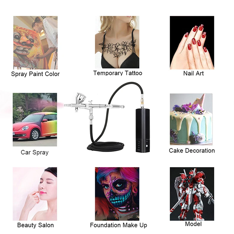This beauty special air compressorcan use for makeup, beauty, nail, temporary tattoos, cake decorating, low dense degree of dye, etc.and shall not be used for spraying thick paint.