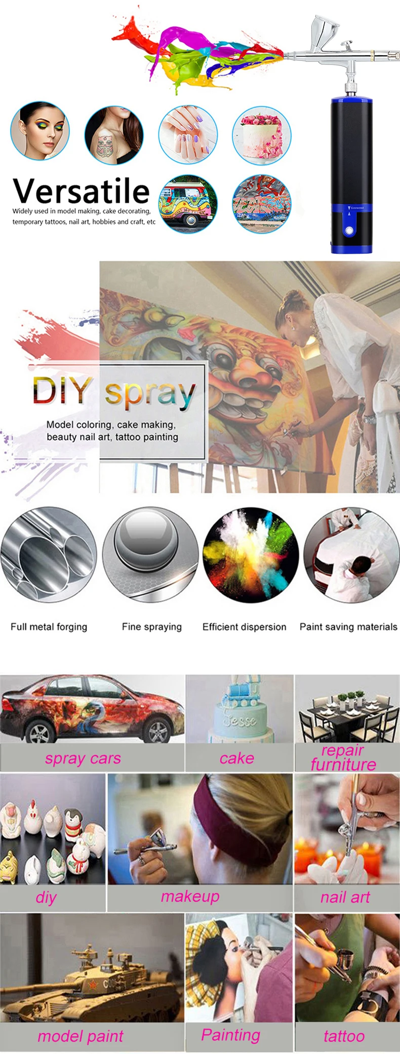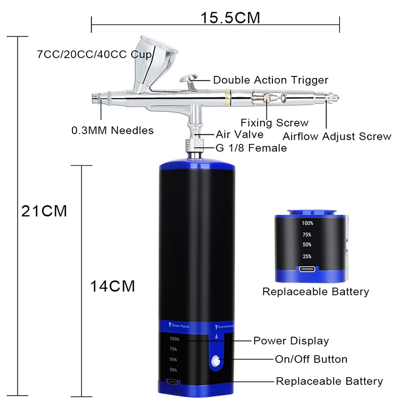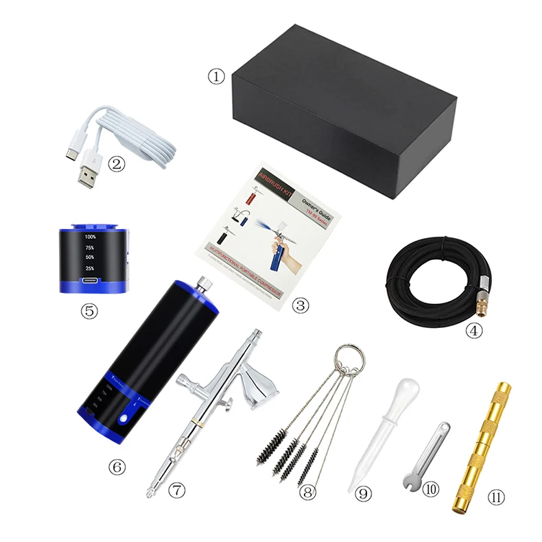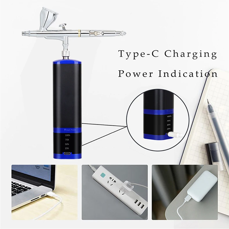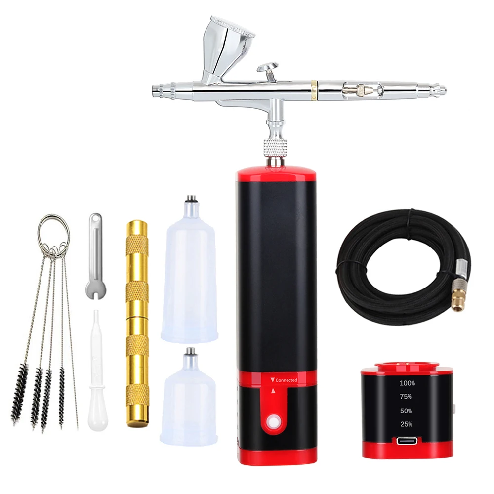 Portable cordless airbrush kit can be used for cake decorating, makeup, nails design, tattoo, model painting, art painting, handicraft and so on.