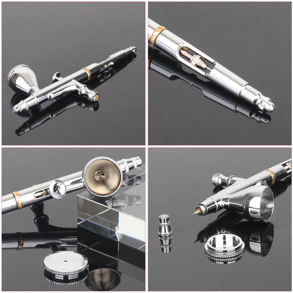 Compared with dual action airbrush,this compact mini airbrush compressor comes with a double-action airbrush.The double-action airbrush kit controls the air volume and the amount of paint at the same time which allows changing the width of the line,the range of value,and the opacity of paint without stopping,that makes your works more professional.