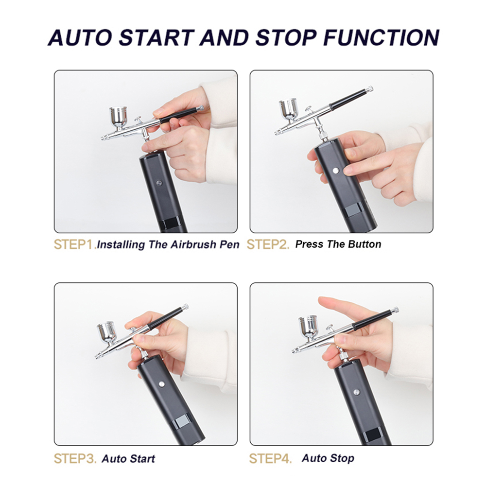This compact mini air compressor comes with a double-action airbrush, removable 7ML metal reservoir and replaceable 20ML 40MLplastic liquid cup. The handheld airbrush kit controls the amount of air and paint at the same time, that makes your works more professional. You can press the power button and then the trigger to spray the water-based liquid pigment or paint out with strong air.