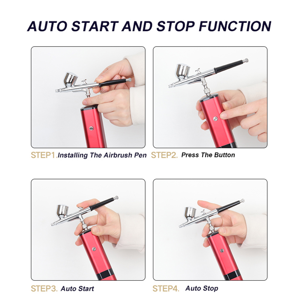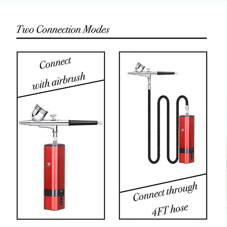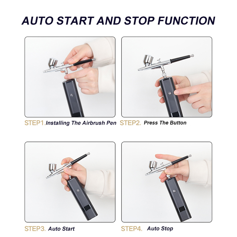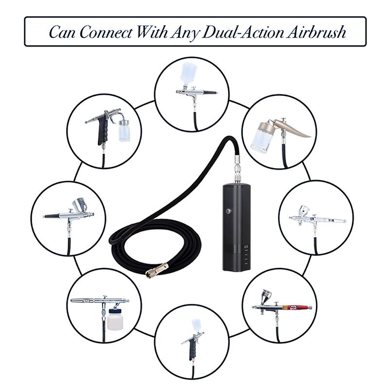 Compared with single action airbrush,this compact mini airbrush compressor comes with a double-action airbrush.The double-action airbrush kit controls the air volume and the amount of paint at the same time which allows changing the width of the line,the range of value,and the opacity of paint without stopping,that makes your works more professional.