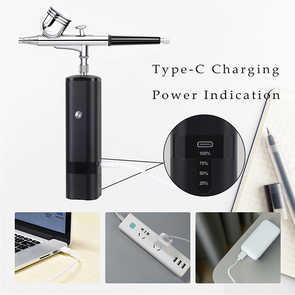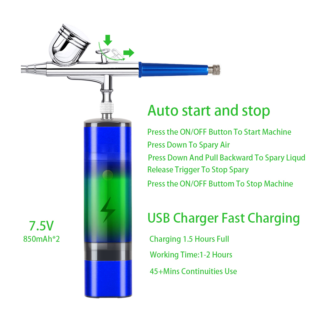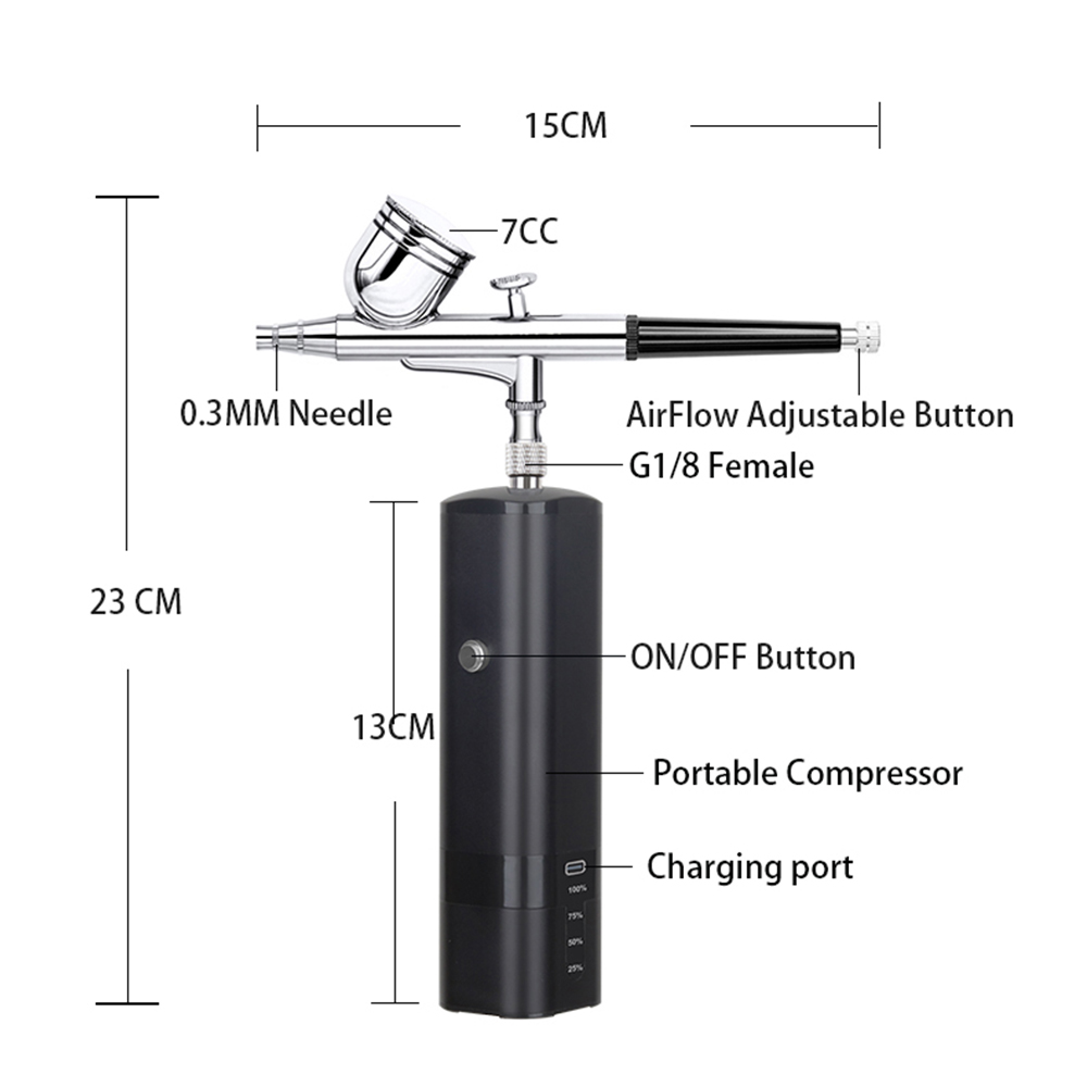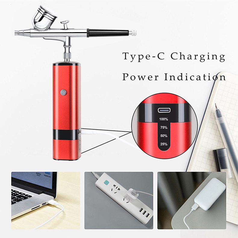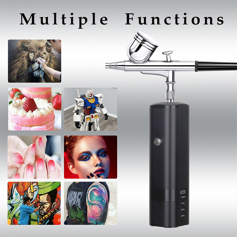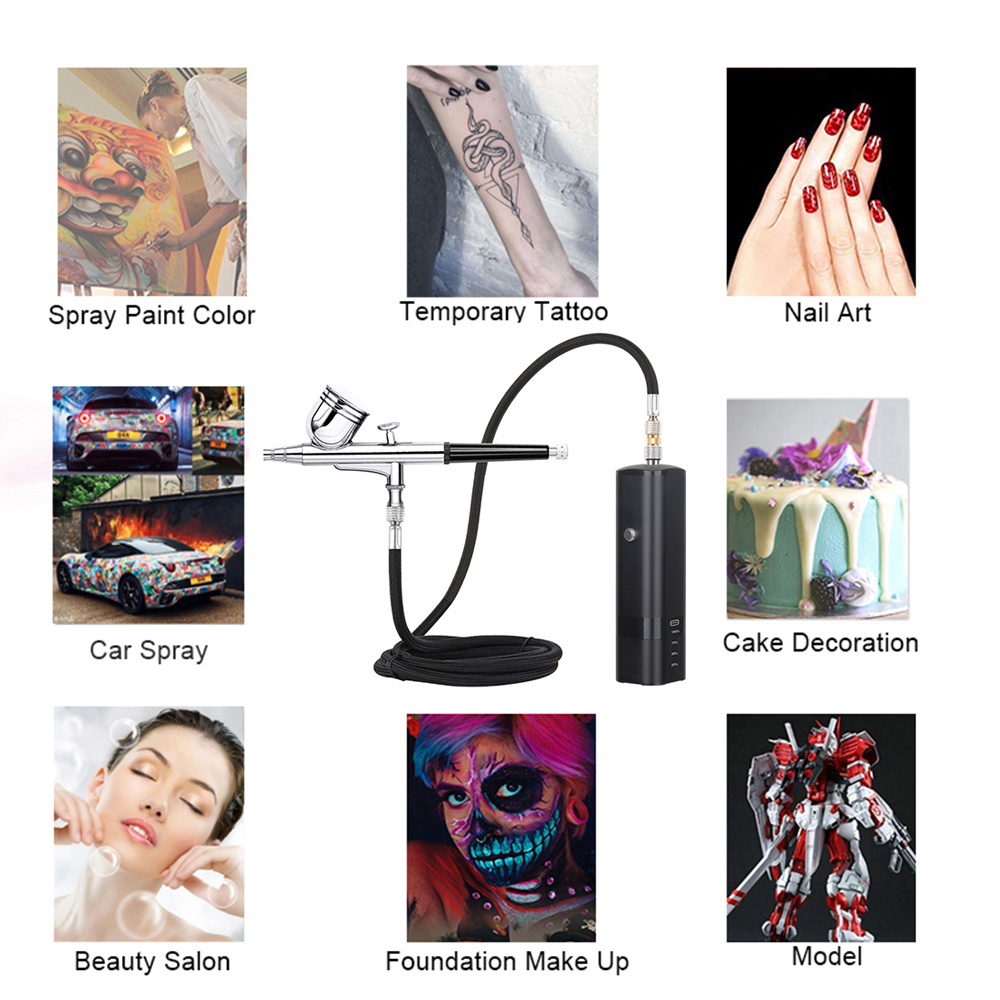 A one-handed rechargeable air brush painting kits and air pump can be placed in your backpack or pocket. Portable and sophisticated spray guns can be used for tattoos, art painting, cake decorating, make-up, nail, handicrafts, T-shirt painting, models painting, face paint, art craft, barber etc. The cordless airbrush gùn is also a wonderful gift for your family or friends.