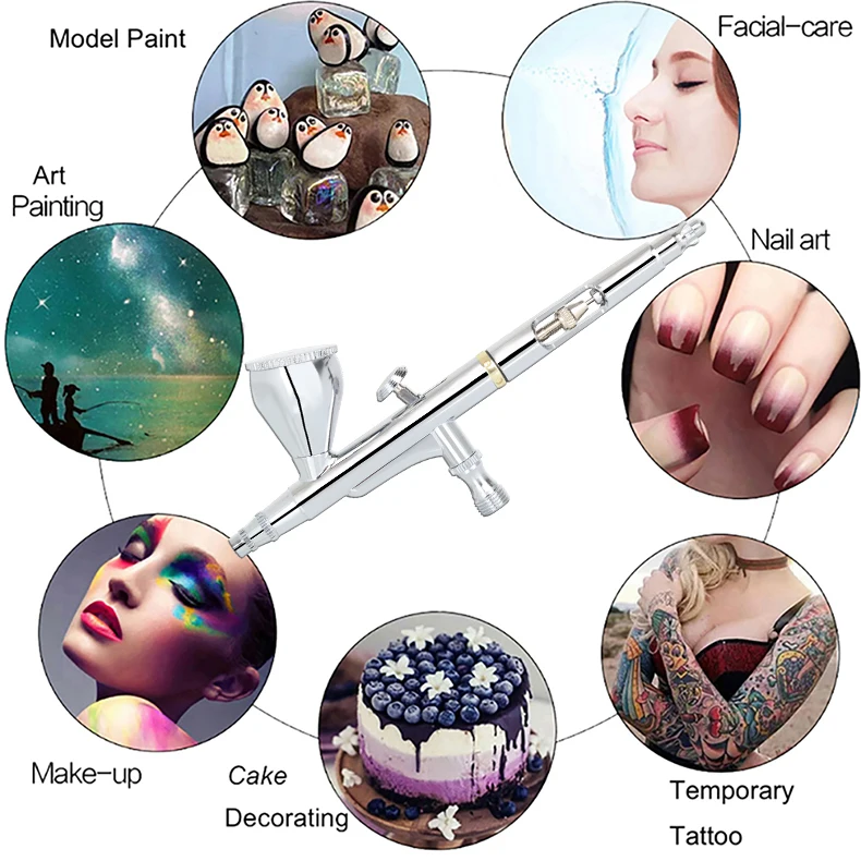 The Side Feed Airbrush kit has a variety of uses. Supports airbrushing for most airbrush types, applications, paint and media and levels of users from beginner to advanced artists. Suitable for hobbies, crafts, nail art, auto graphics temporary tattoos, tanning, cake decorating, etc.