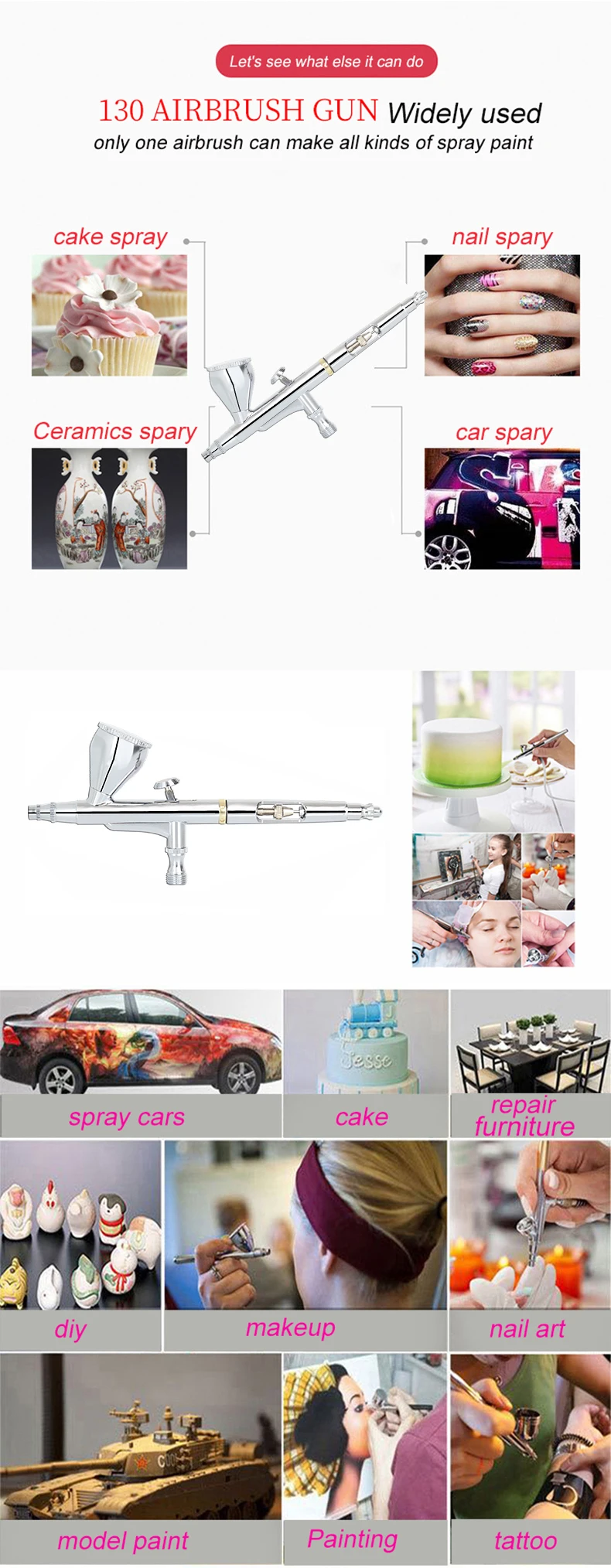 This beauty special air compressorcan use for makeup, beauty, nail, temporary tattoos, cake decorating, low dense degree of dye, etc.and shall not be used for spraying thick paint.