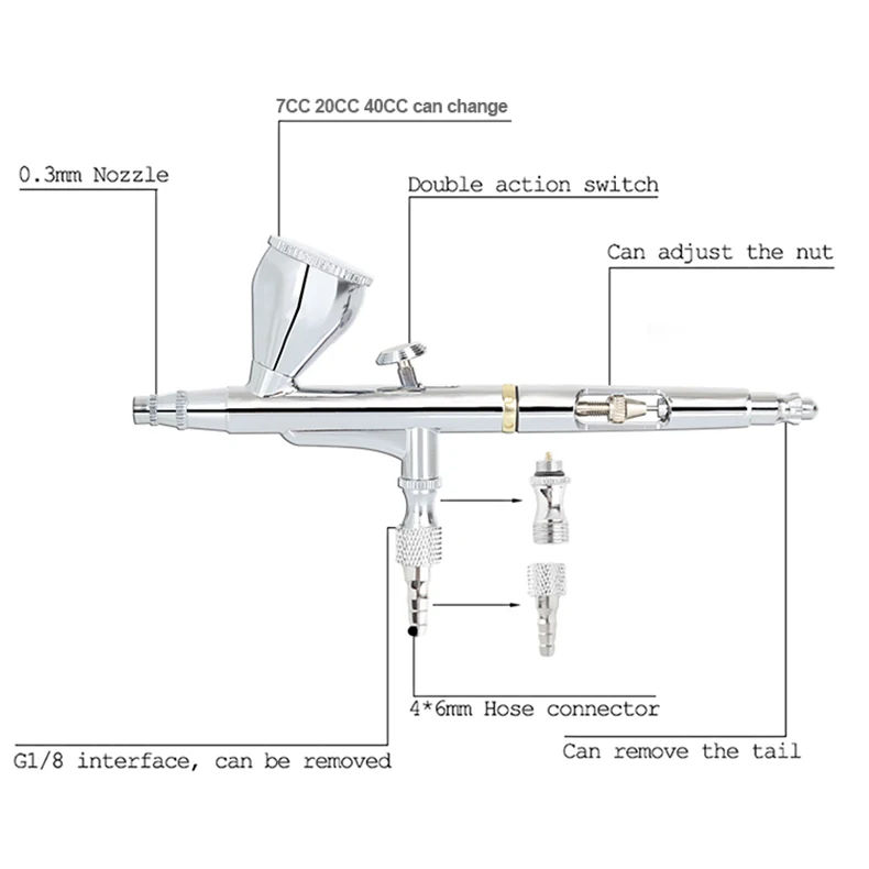 Dual-action Trigger Airbrush kits . It allows users to determine the quantity of air and fluid released with simply fingers' moves. Provides exceptional atomization and accurate spray control.