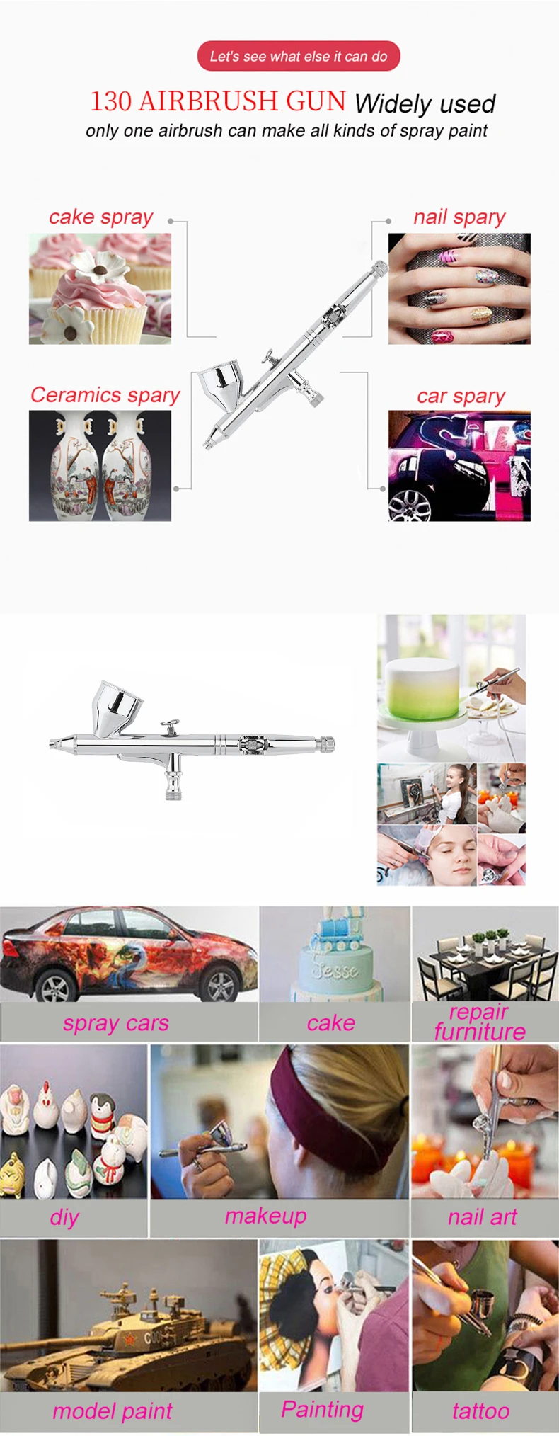 This beauty special air compressorcan use for makeup, beauty, nail, temporary tattoos, cake decorating, low dense degree of dye, etc.and shall not be used for spraying thick paint.