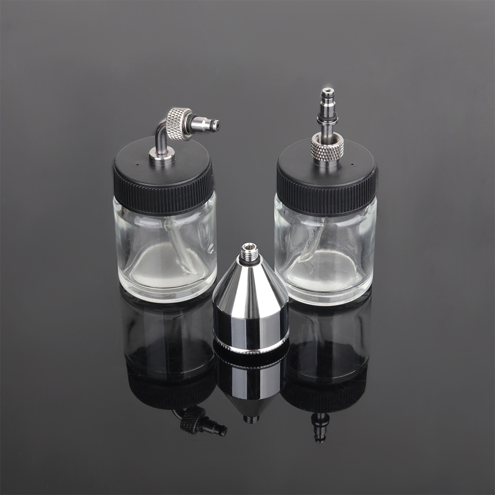 We provide 7CC replaceable copper metal cup for gravity feeding, 2 glass cups for siphon and side feeding. If you want use bigger volume cup, you can replace it easily. Dual-action trigger is an additional function which will bring convenience when you airbrush spraying.